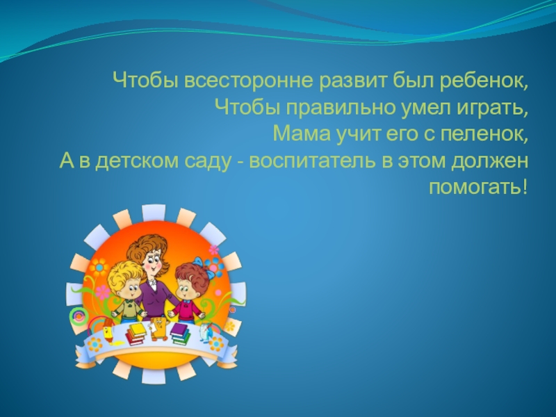 Чтобы всесторонне развит был ребенок, Чтобы правильно умел играть, Мама учит его с пеленок, А в детском саду - воспитатель в этом должен помогать!