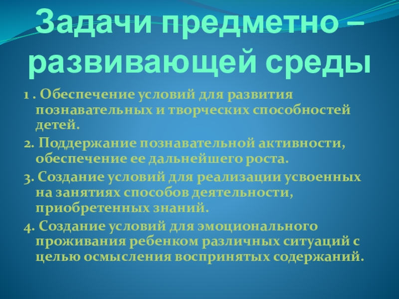 Задачи предметно – развивающей среды1 . Обеспечение условий для развития познавательных и творческих способностей детей.2. Поддержание познавательной