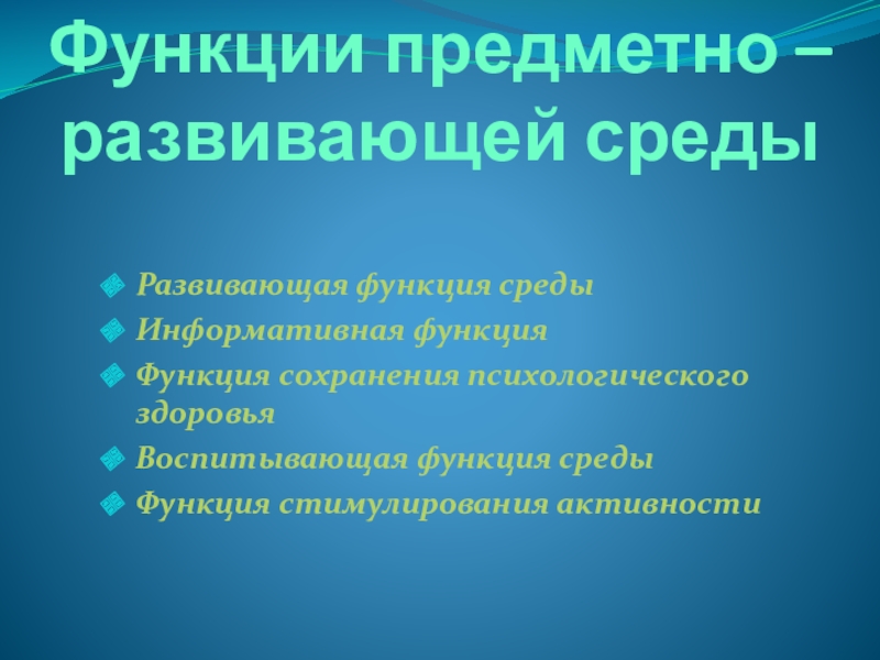 Функции предметно – развивающей средыРазвивающая функция среды Информативная функцияФункция сохранения психологического здоровьяВоспитывающая функция среды Функция стимулирования активности