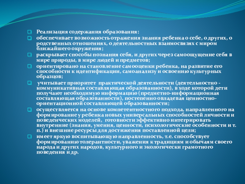 Реализация содержания образования:обеспечивает возможность отражения знания ребенка о себе, о других, о родственных отношениях, о деятельностных взаимосвязях