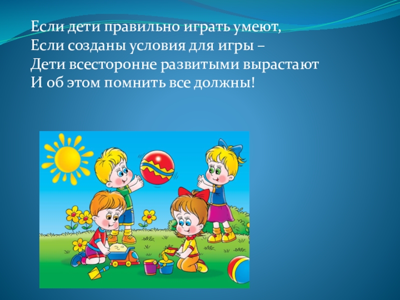 Если дети правильно играть умеют, Если созданы условия для игры – Дети всесторонне развитыми вырастают И