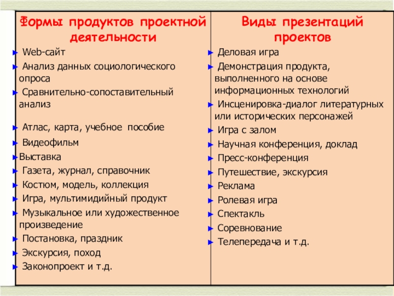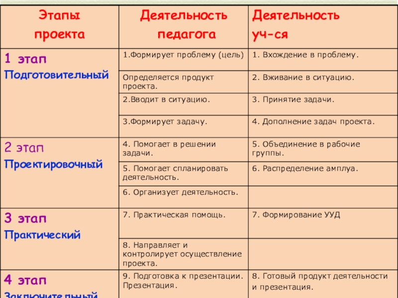 2) этапов проектирования (выработка концепции, определение целей и задач проекта, доступных и оптимальных ресурсов деятельности, создание плана, программ и организация деятельности по реализации проекта);