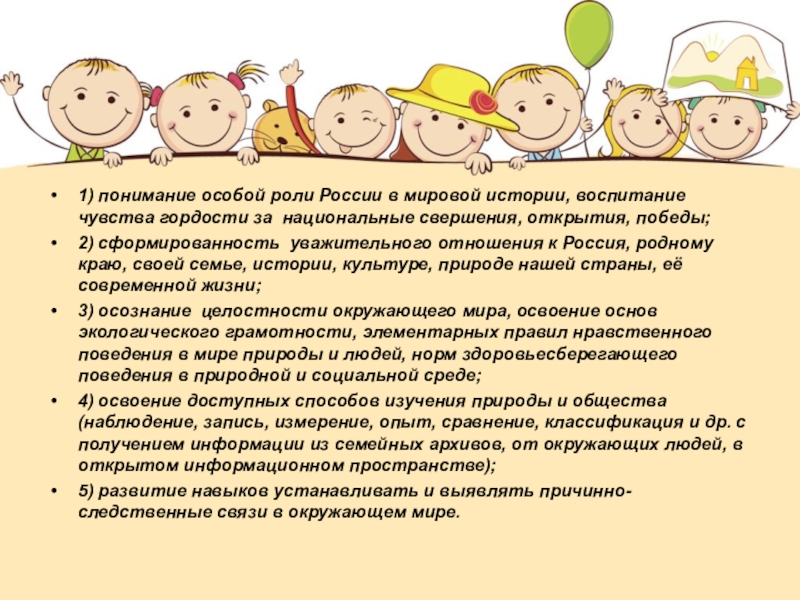 Слайд 51) понимание особой роли России в мировой истории, воспитание чувства гордости