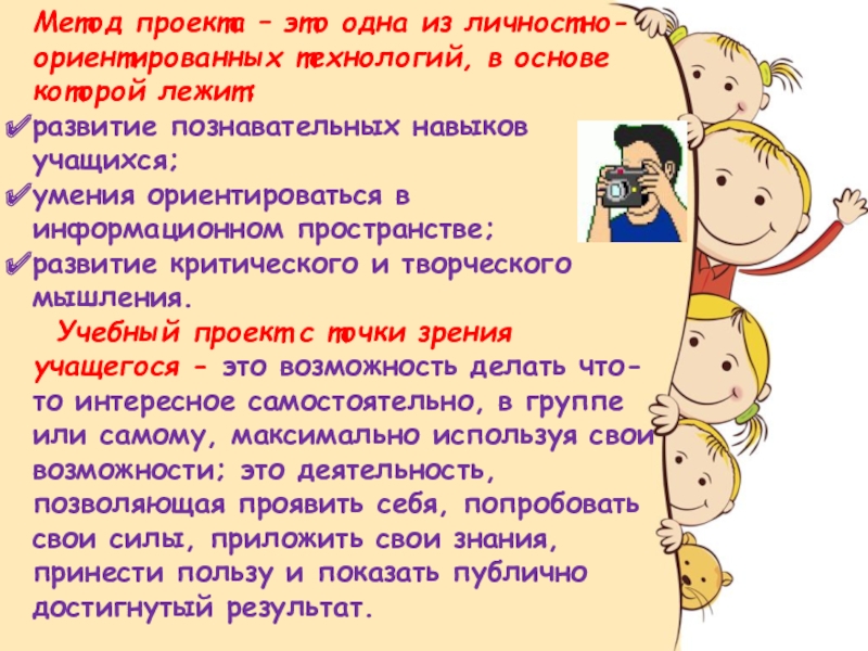 Метод проекта – это одна из личностно-ориентированных технологий, в основе которой