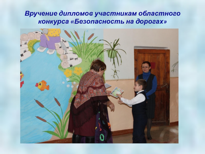Слайд 6Вручение дипломов участникам областного конкурса «Безопасность на дорогах»