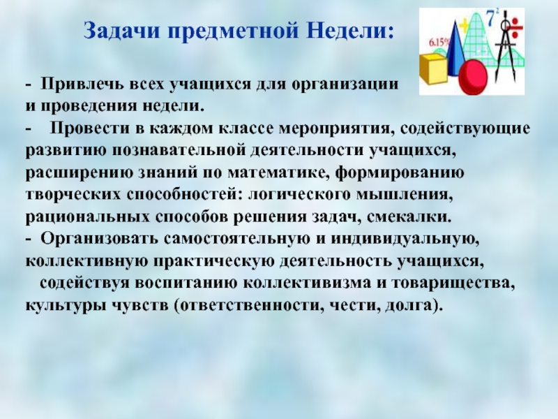 Задачи предметной Недели:-  Привлечь всех учащихся для организации и проведения недели.-    Провести в каждом классе мероприятия, содействующие развитию познавательной деятельности учащихся, расширению знаний по математике, формированию творческих способностей: логического мышления, рациональных способов решения