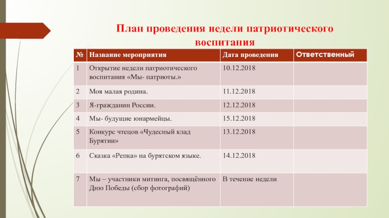 Слайд 2План проведения недели патриотического воспитания
