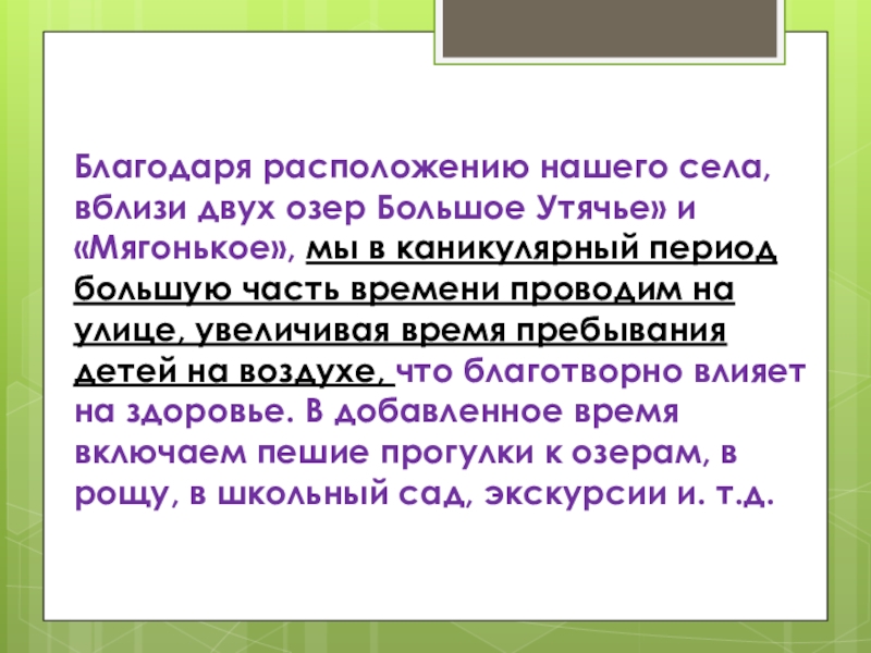 Слайд 17Благодаря расположению нашего села, вблизи двух озер Большое Утячье» и «Мягонькое»,
