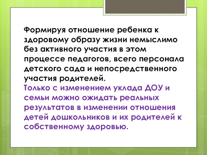 Только с изменением уклада ДОУ и семьи можно ожидать реальных результатов в изменении отношения детей дошкольников и их родителей к собственному здоровью.