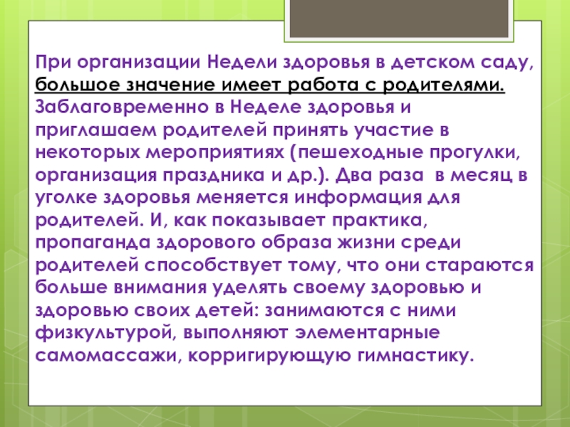 Слайд 23При организации Недели здоровья в детском саду, большое значение имеет работа