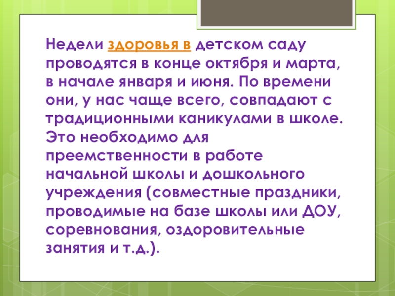 Слайд 10Недели здоровья в детском саду проводятся в конце октября и марта, в начале