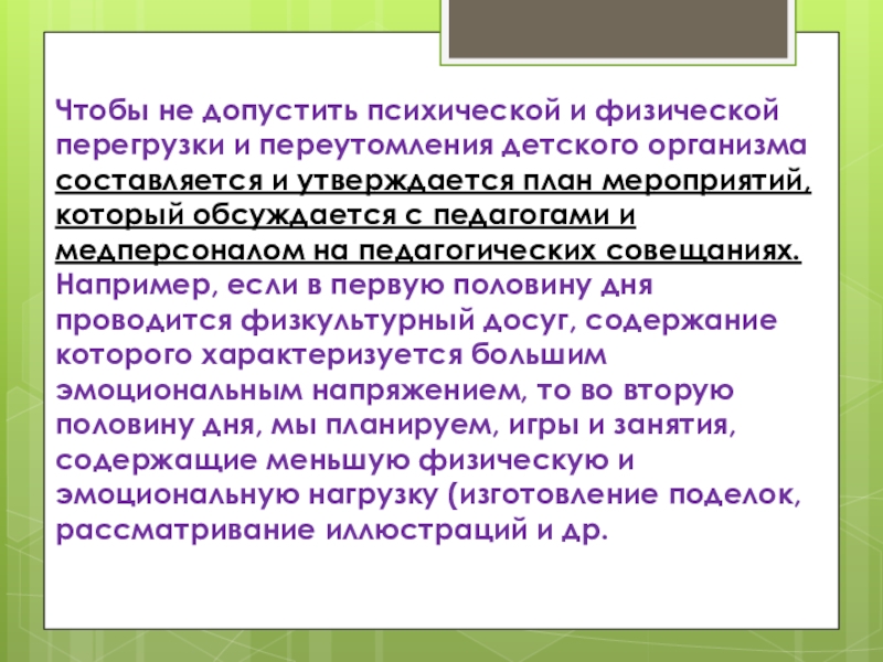 Слайд 29Чтобы не допустить психической и физической перегрузки и переутомления детского организма