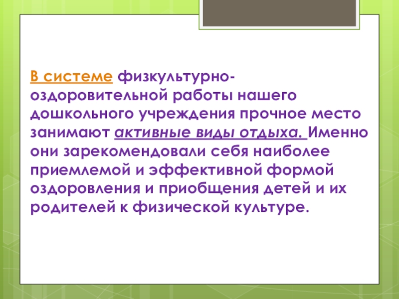 Слайд 6В системе физкультурно-оздоровительной работы нашего дошкольного учреждения прочное место занимают активные виды