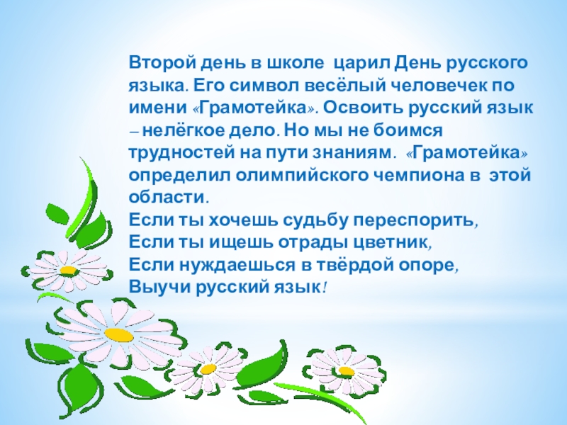 Второй день в школе  царил День русского языка. Его символ весёлый человечек по имени «Грамотейка». Освоить русский