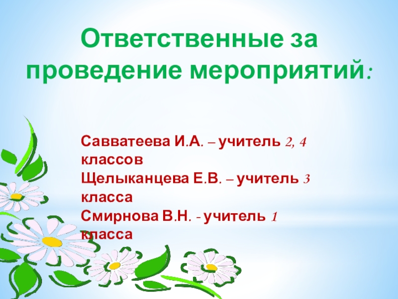 Ответственные за проведение мероприятий:Савватеева И.А. – учитель 2, 4 классовЩелыканцева Е.В. – учитель 3 классаСмирнова В.Н. -