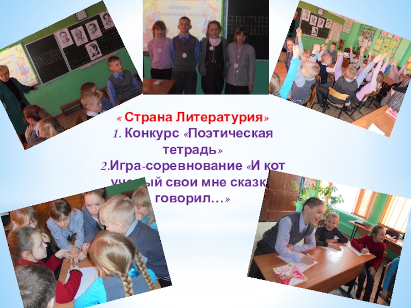 « Страна Литературия» 1. Конкурс «Поэтическая тетрадь» 2.Игра-соревнование «И кот ученый свои мне сказки говорил…»