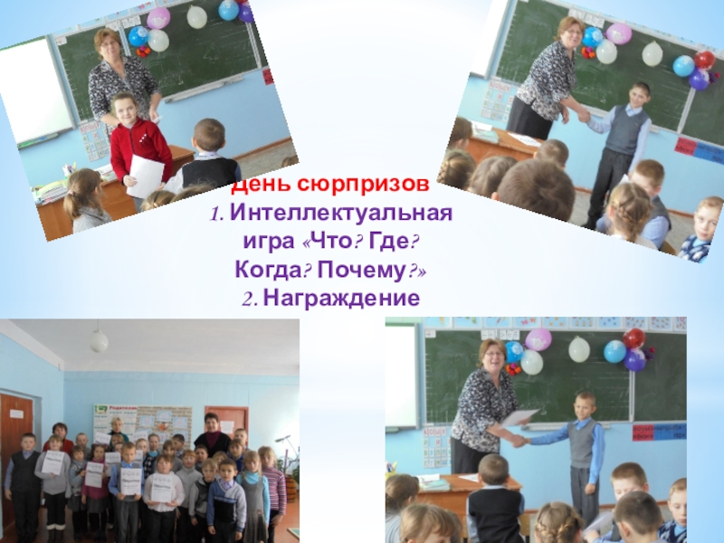 День сюрпризов1. Интеллектуальная игра «Что? Где? Когда? Почему?»2. Награждение