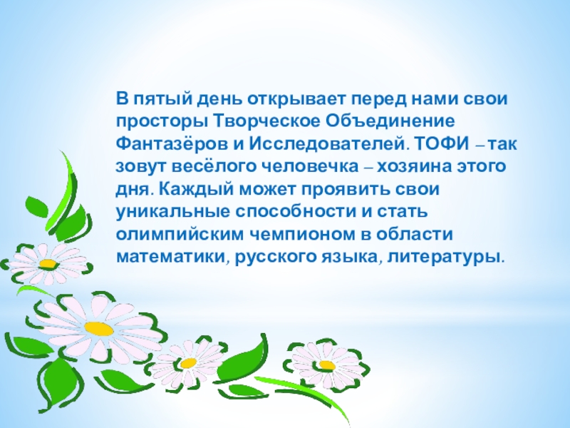 В пятый день открывает перед нами свои просторы Творческое Объединение Фантазёров и Исследователей. ТОФИ – так зовут