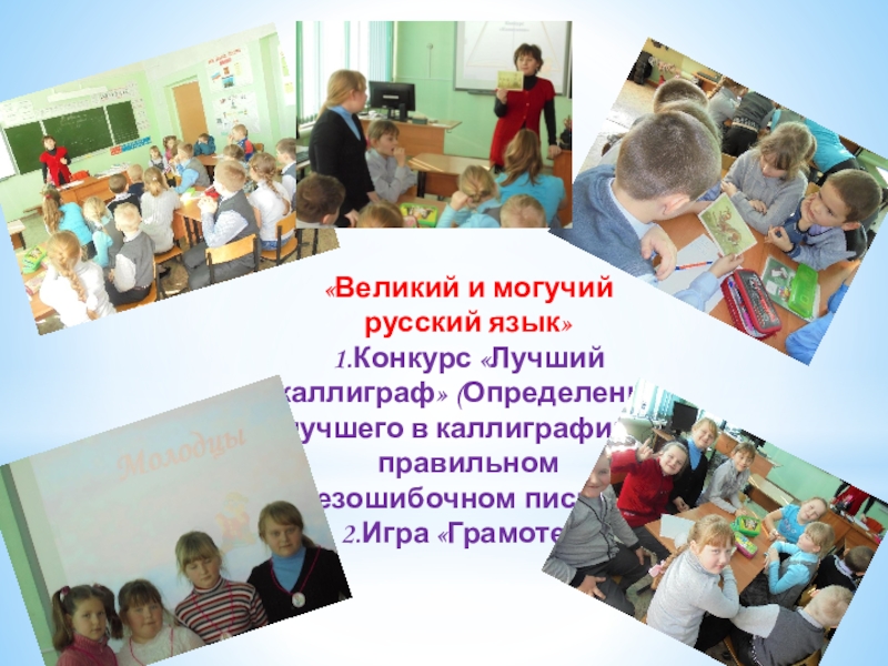 «Великий и могучий русский язык»1.Конкурс «Лучший каллиграф» (Определение лучшего в каллиграфии и правильном безошибочном письме)2.Игра «Грамотеи»