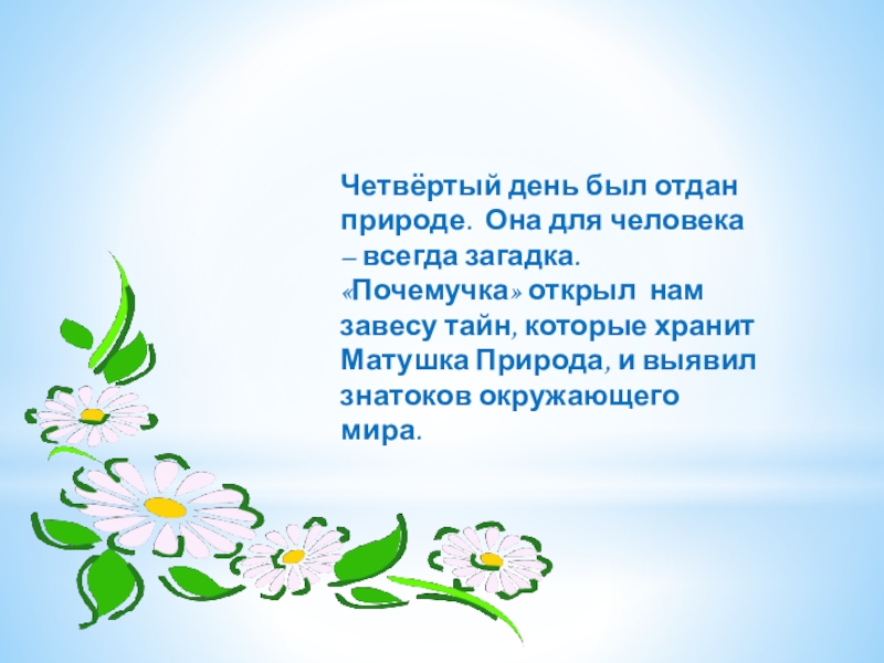 Слайд 10Четвёртый день был отдан  природе.  Она для человека – всегда загадка.