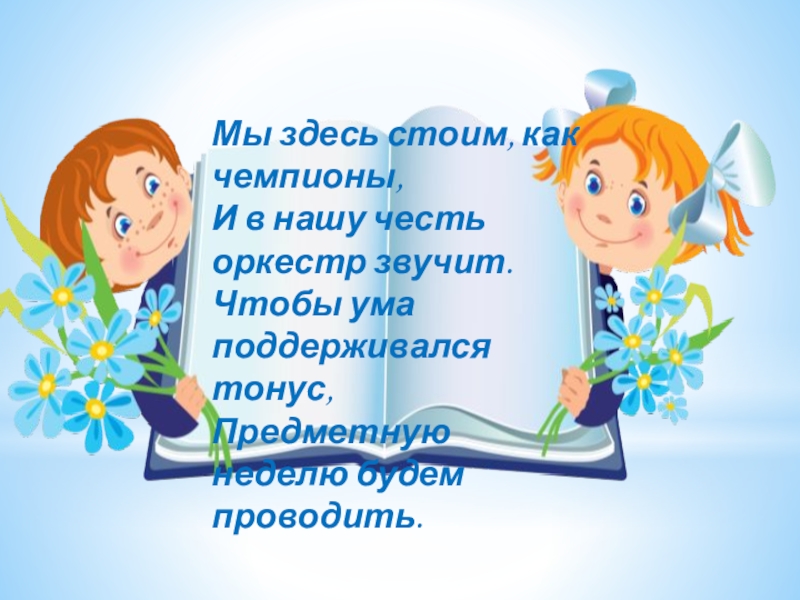 Мы здесь стоим, как чемпионы,И в нашу честь оркестр звучит.Чтобы ума поддерживался тонус,Предметную неделю будем проводить.