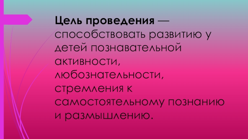 Слайд 2Цель проведения — способствовать развитию у детей познавательной активности, любознательности, стремления