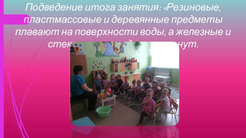 Слайд 4Подведение итога занятия: «Резиновые, пластмассовые и деревянные предметы плавают на поверхности