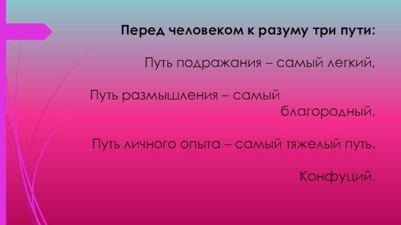 Путь подражания – самый легкий,                                                                 Путь размышления – самый благородный,                                                                     Путь личного опыта – самый тяжелый путь.                                                                                             Конфуций.