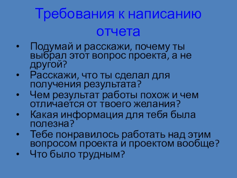 Требования к написанию отчета Подумай и расскажи, почему ты выбрал этот вопрос проекта, а не другой? Расскажи,