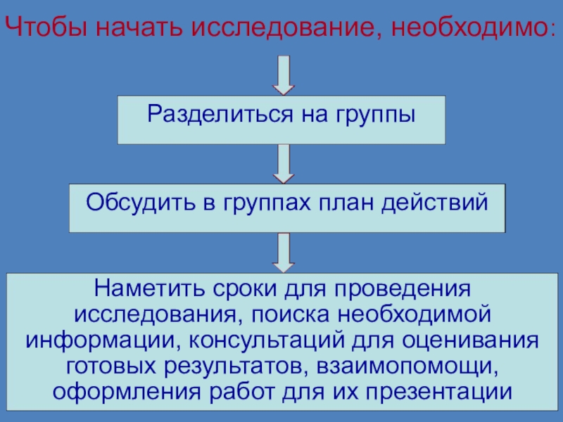Чтобы начать исследование, необходимо:Разделиться на группыОбсудить в группах план действийНаметить сроки для проведения исследования, поиска необходимой информации,
