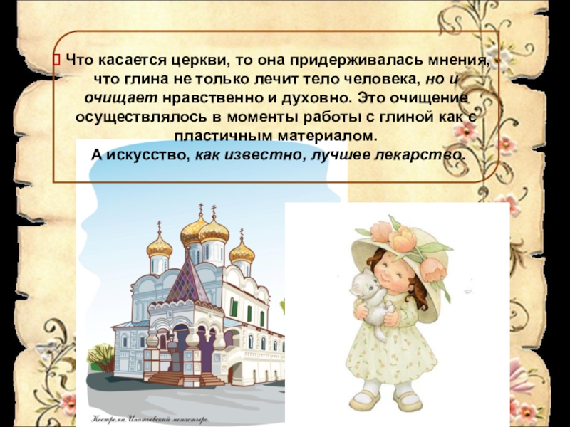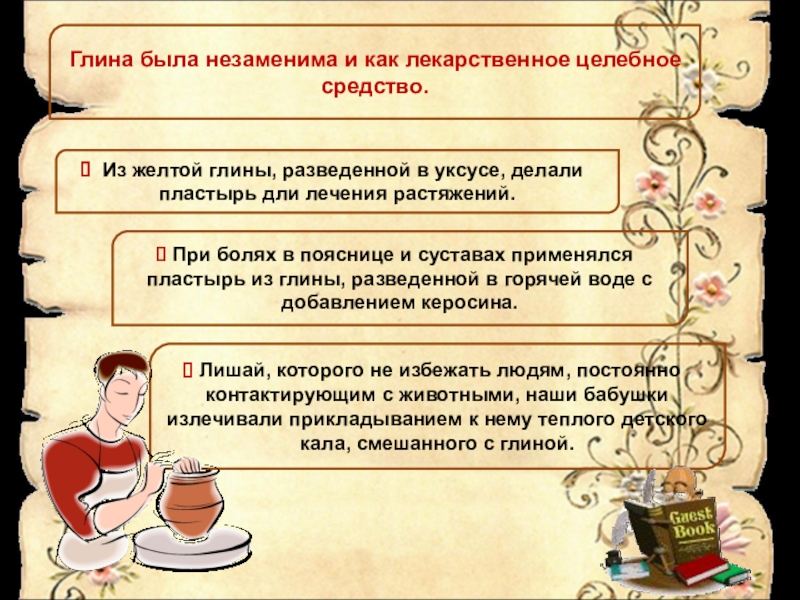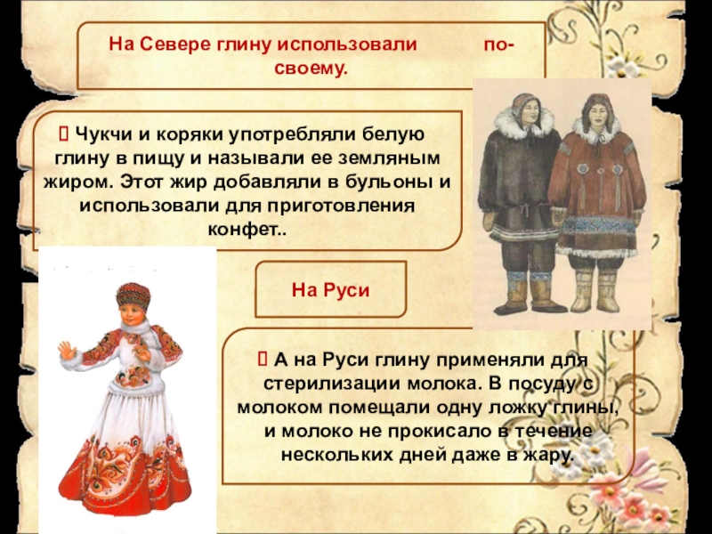 А на Руси глину применяли для стерилизации молока. В посуду с молоком помещали одну ложку глины, и молоко не прокисало в течение нескольких дней даже в жару.