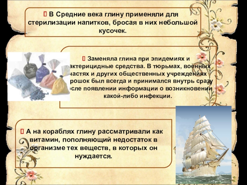 А на кораблях глину рассматривали как витамин, пополняющий недостаток в организме тех веществ, в которых он нуждается.