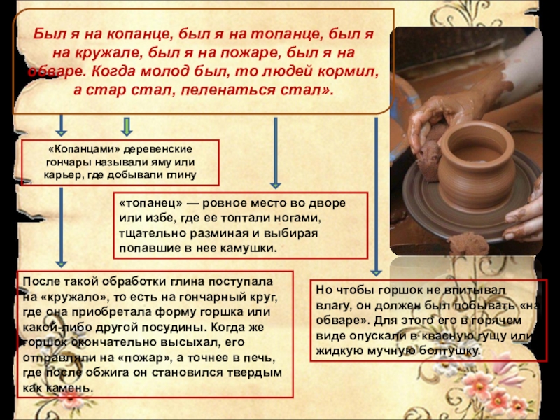 После такой обработки глина поступала на «кружало», то есть на гончарный круг, где она приобретала форму горшка или какой-либо другой посудины. Когда же горшок окончательно высыхал, его отправляли на «пожар», а точнее в печь, где после обжига он становился твердым как камень.