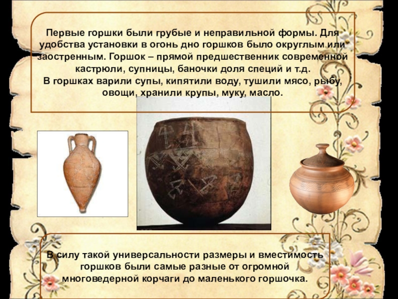 В силу такой универсальности размеры и вместимость горшков были самые разные от огромной многоведерной корчаги до маленького горшочка.