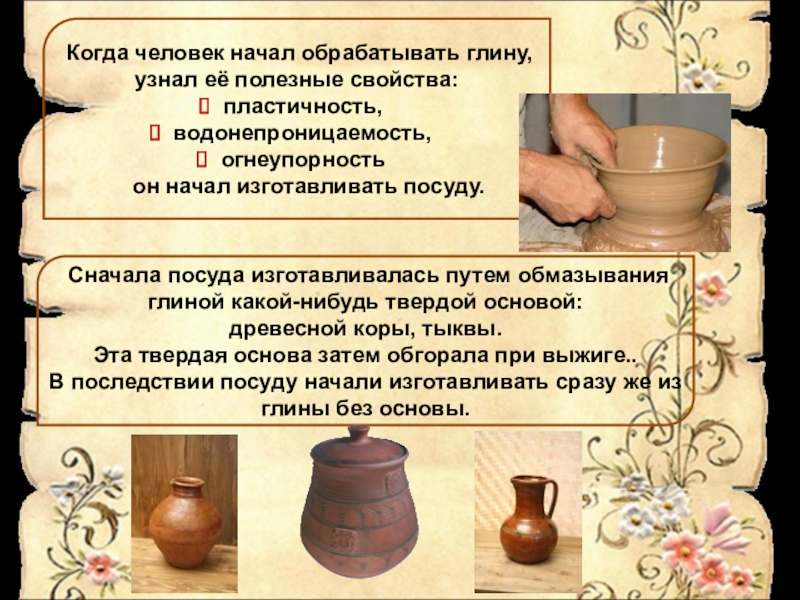 Сначала посуда изготавливалась путем обмазывания глиной какой-нибудь твердой основой: древесной коры, тыквы.