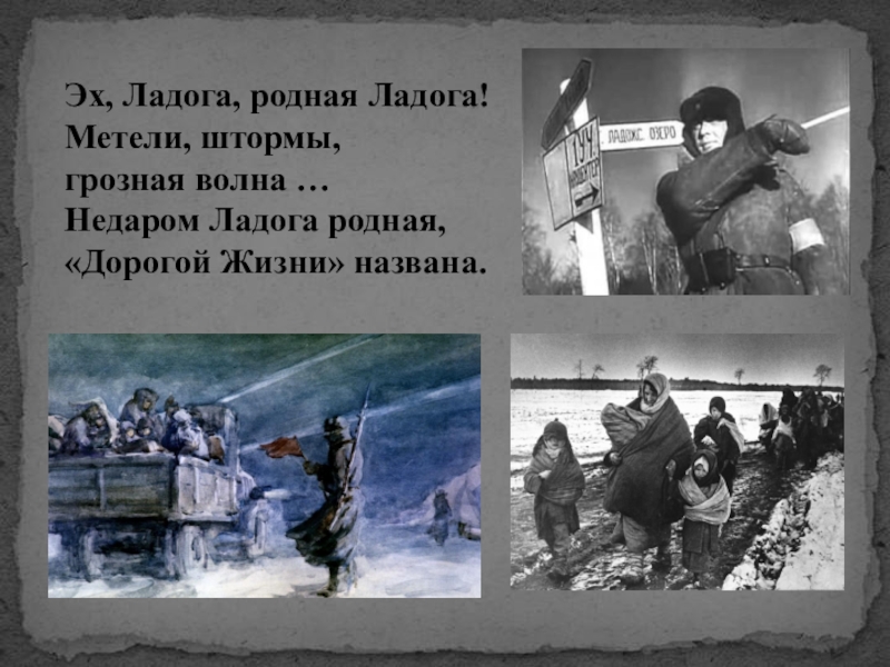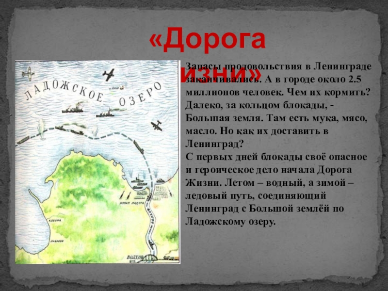 С первых дней блокады своё опасное и героическое дело начала Дорога Жизни. Летом – водный, а зимой – ледовый путь, соединяющий Ленинград с Большой землёй по Ладожскому озеру.