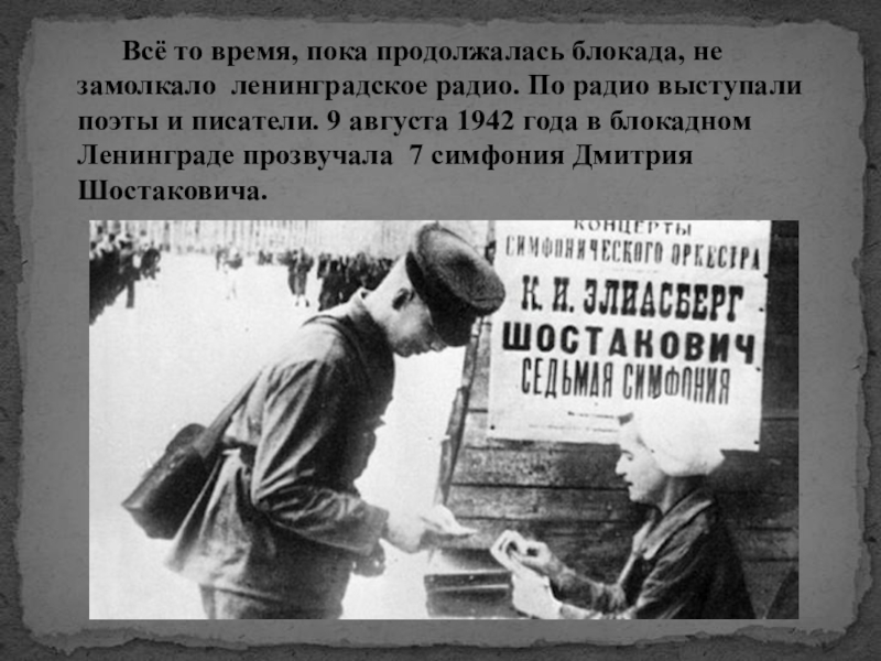 ленинградское радио. По радио выступали поэты и писатели. 9 августа 1942 года в блокадном Ленинграде прозвучала 7 симфония Дмитрия Шостаковича.