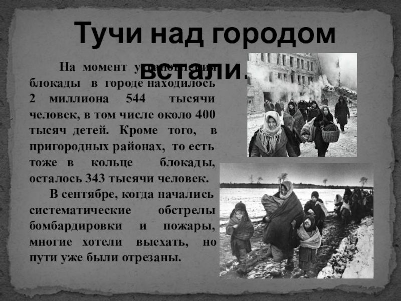 человек, в том числе около 400 тысяч детей. Кроме того, в пригородных районах, то есть тоже в кольце блокады, осталось 343 тысячи человек.