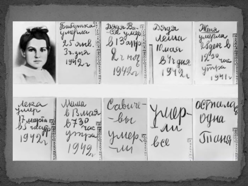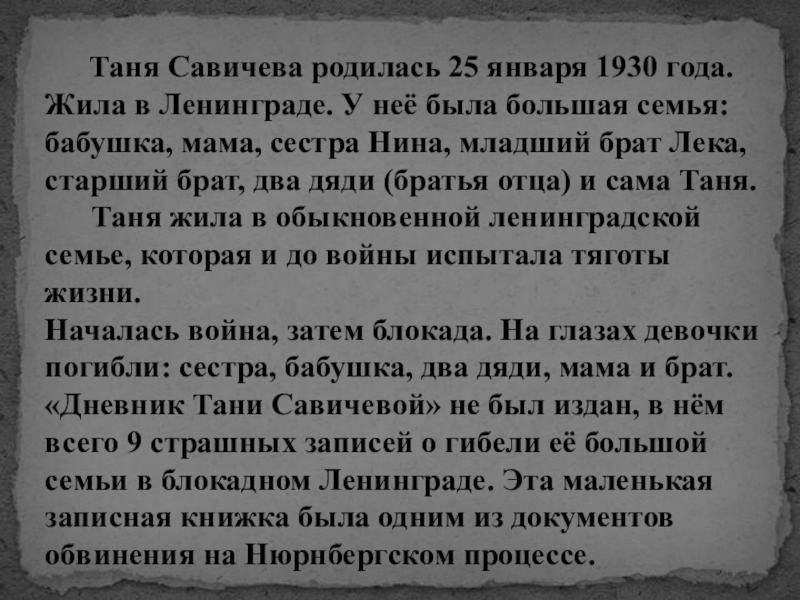 «Дневник Тани Савичевой» не был издан, в нём всего 9 страшных записей о гибели её большой семьи в блокадном Ленинграде. Эта маленькая записная книжка была одним из документов обвинения на Нюрнбергском процессе.