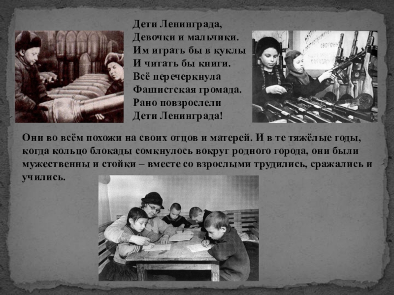 Они во всём похожи на своих отцов и матерей. И в те тяжёлые годы, когда кольцо блокады сомкнулось вокруг родного города, они были мужественны и стойки – вместе со взрослыми трудились, сражались и учились.