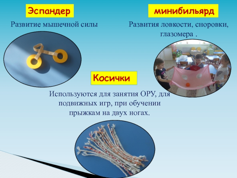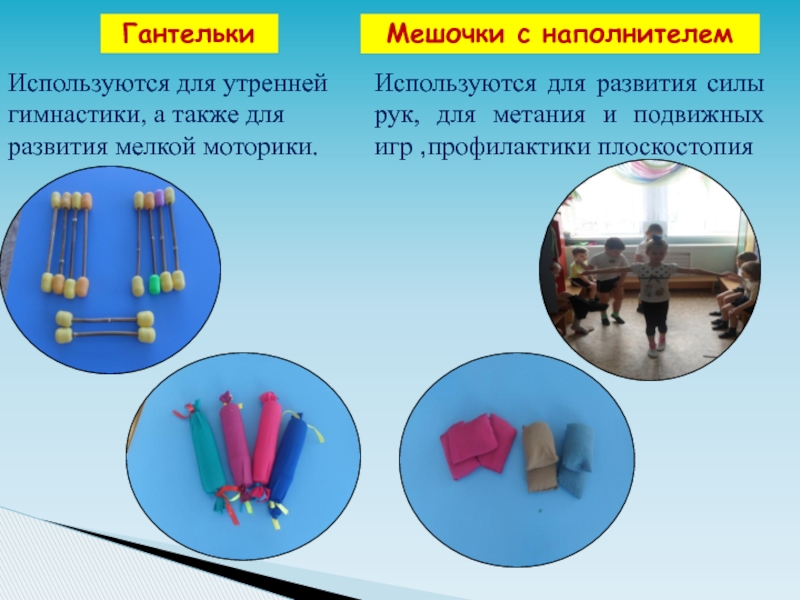 Используются для развития силы рук, для метания и подвижных игр ,профилактики плоскостопия