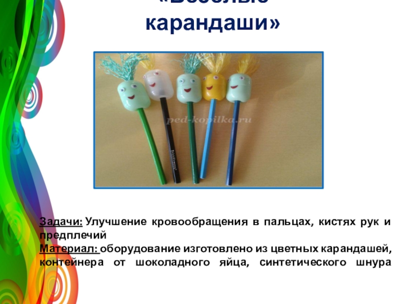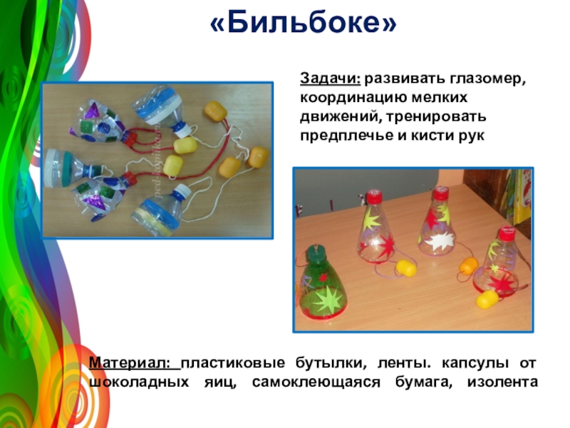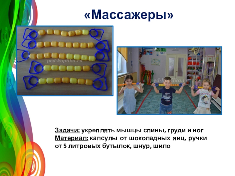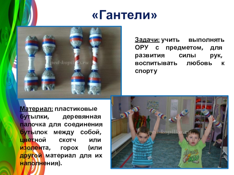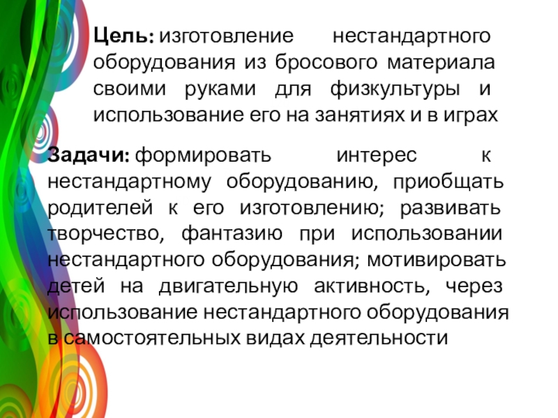 Задачи: формировать интерес к нестандартному оборудованию, приобщать родителей к его изготовлению; развивать творчество, фантазию при использовании нестандартного оборудования; мотивировать детей на двигательную активность, через использование нестандартного оборудования в самостоятельных видах деятельности