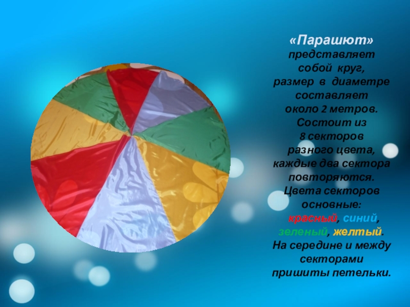 Слайд 2«Парашют» представляет собой круг, размер в диаметре составляет около 2 метров.