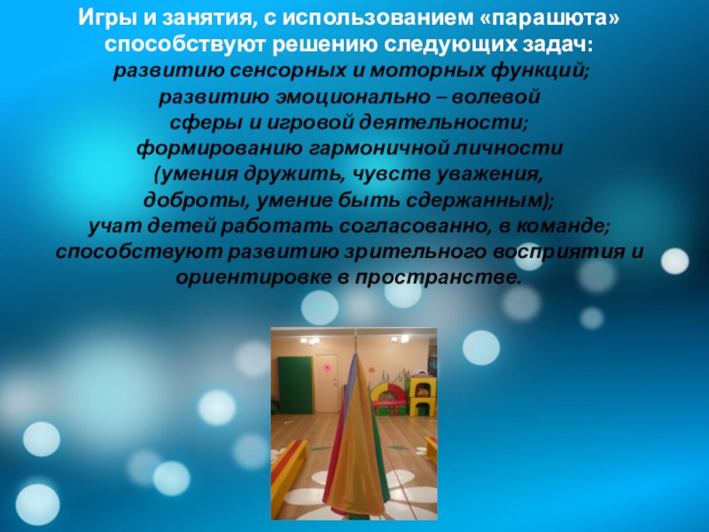 Слайд 3Игры и занятия, с использованием «парашюта» способствуют решению следующих задач: развитию