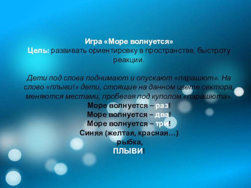 поднимают и опускают «парашют». На слово «плыви!» дети, стоящие на данном цвете сектора, меняются местами, пробегая под куполом «парашюта». Море волнуется – раз! Море волнуется – два! Море волнуется – три! Синяя (желтая, красная…) рыбка, ПЛЫВИ!