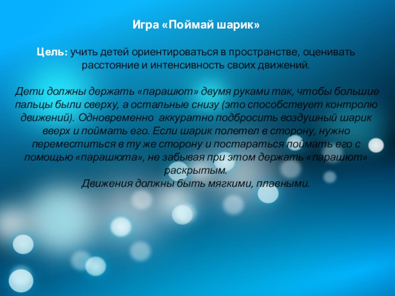 интенсивность своих движений.  Дети должны держать «парашют» двумя руками так, чтобы большие пальцы были сверху, а остальные снизу (это способствует контролю движений). Одновременно аккуратно подбросить воздушный шарик вверх и поймать его. Если шарик полетел в сторону, нужно переместиться в ту же сторону и постараться поймать его с помощью «парашюта», не забывая при этом держать «парашют» раскрытым. Движения должны быть мягкими, плавными.
