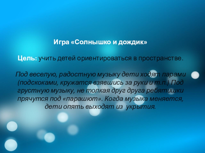 Слайд 4Игра «Солнышко и дождик» Цель: учить детей ориентироваться в пространстве.   Под веселую,