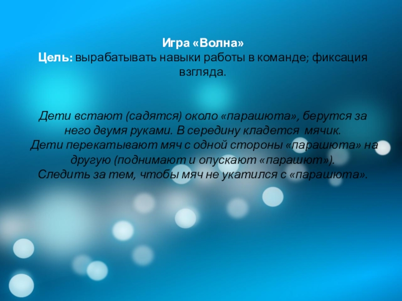 Игра «Волна» Цель: вырабатывать навыки работы в команде; фиксация взгляда.   Дети встают (садятся) около «парашюта»,