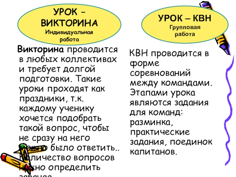 КВН проводится в форме соревнований между командами. Этапами урока являются задания для команд: разминка, практические задания, поединок капитанов.