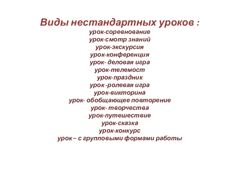 Слайд 2Виды нестандартных уроков : урок-соревнование урок-смотр знаний урок-экскурсия урок-конференция урок- деловая игра урок-телемост урок-праздник урок -ролевая игра урок-викторина урок-